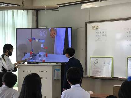理科の授業では、実験の映像をもとに、謎の解明をしていました。画面を使っての発表もおてのものですね。