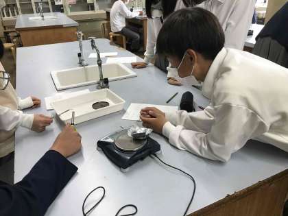 理科の実験です。化学反応について、学習しています。本日は火も取り扱う実験なので、慎重に行なっていました。