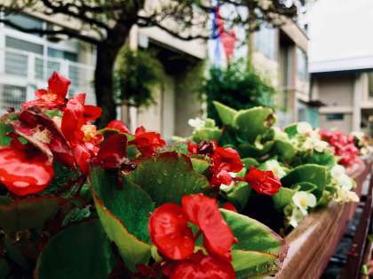 環境委員会が植えてくれた校門の花がきれいに咲いています。みなさんも雨に負けず、1期のラストスパートを!!