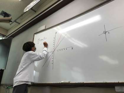 数学では、一次関数のグラフの書き方を学びました。比例のグラフが、上下に平行移動し、新しいグラフの形となりました。