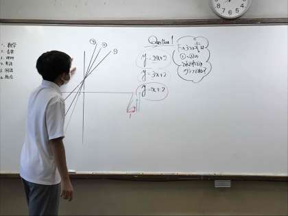 今日は1人ずつ、先生に対して解き方を説明するテストを行いました。内容はグラフから式を読み取る です。
