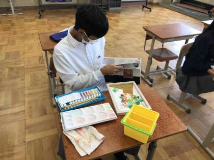 美術では作品への色塗りが始まりました。自分の作品にじっくり手をかけていますね。