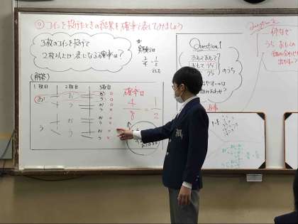 確率の学習では、サイコロ・レースの着順に続き、コインの表裏について考えました。2枚のコイン・3枚のコインを投げた時の出かたから確率を求めることができましたね。