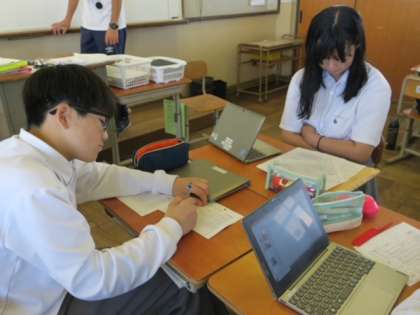 今回はGIGA端末を活用し,知っている言葉をそのまま使うのではなく「類義語」を探したり他の言葉に置き換えて表現することを意識しました。もう少し推敲をして完成させたいという生徒もいました。「タブレットを持って帰って,家から提出してもいいですか?」と意欲的に取り組もうとしている姿が頼もしかったです。提出BOXに提出された詩は,先生の端末から添削をして,1人1人返却しています。
