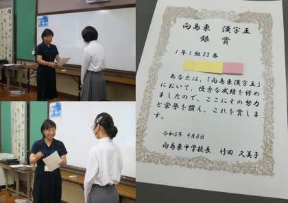 向島東漢字王の表彰が行われました。昼食時間を使って,zoomで中継を行いました。金賞(100点)を取った生徒に,校長先生から賞状が手渡されました。銀賞の生徒は,教科担当の先生から名前が読み上げられ,教室で賞状が渡されました。みんなとても頑張っていました。