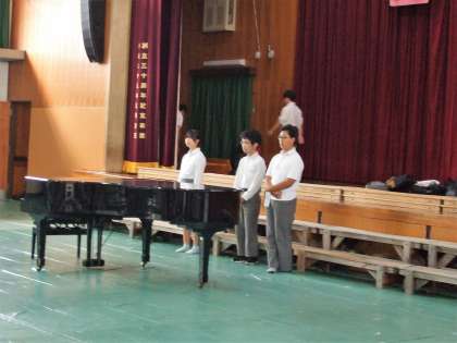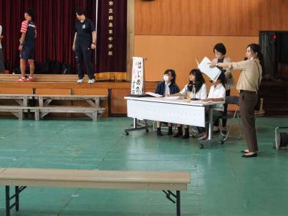 明日の準備が体育館で行われています。合唱委員、環境委員、生徒会本部のみなさんありがとうございました。また放送部の皆さんも明日のリハーサルご苦労様でした。
