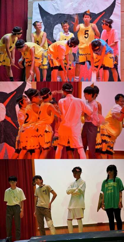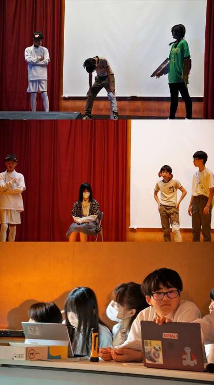 1年生の学年劇では『その後の桃太郎』が演じられました。桃太郎と鬼たちのその後を描いた創作劇。かわいい鬼たちがステージの上で大暴れ!?