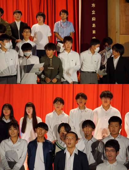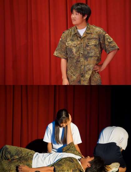 ステージの部の最後は3年生の発表です。『あの日をのりこえて』78年前の太平洋戦争の沖縄戦を舞台にした創作劇です。これまでの平和学習を振り返り平和への思いを込めた発表です。最後は『いのちの歌』を学年で歌い戦争の愚かさをしっかりと訴えることができました。