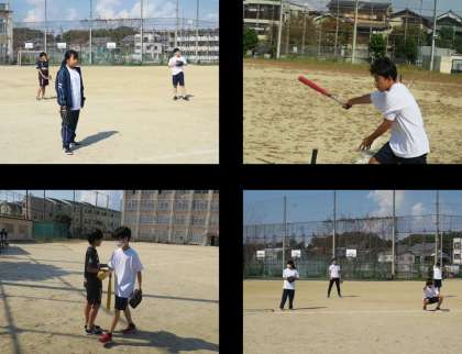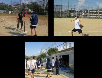 1年生は体育の授業で、ベースボールに挑戦しています。野球経験のある生徒が、打席の近くで仲間にアドバイスを出していました。打つ角度と、下半身の体の運び方を工夫していました。