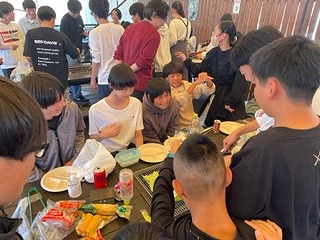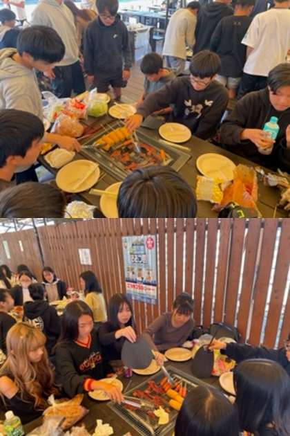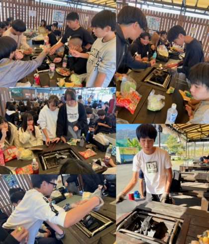 火おこしを各グループで協力して行いました。火がつくまではマシュマロで我慢してましたが、ついにお肉投入!しっかり焼いて食べてくださいね。