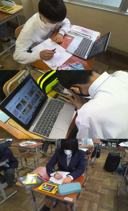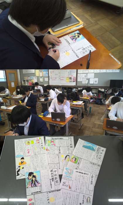 中学校に入学して初めての古典の学習に取り組みました。「竹取物語」では、教科書の学習を終えた後、タブレット端末や図書室の本を利用して、教科書以外のエピソードを学習しました。竹取物語の当時の状況を伝える「新聞」を作成しました。中には、当時の文化を調べて「広告」を掲載している人も…。とても集中して取り組んでいました。