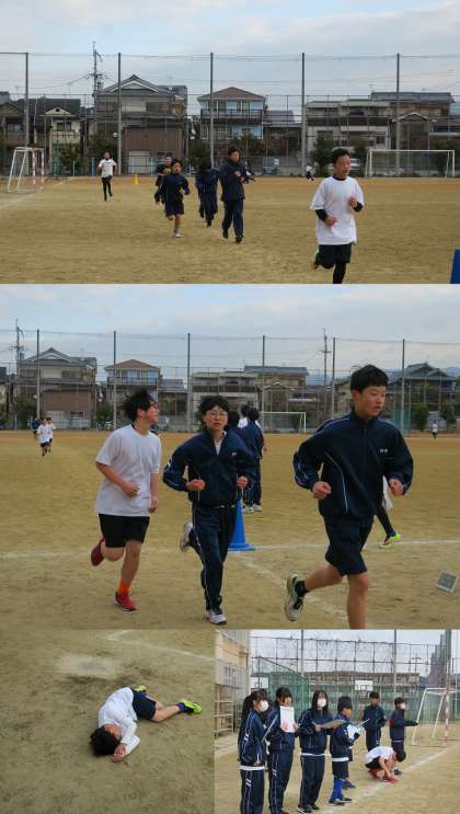しんどいな…やめたいな…と思うことも、自分の力を振り絞って一歩を踏み出す。持久走に取り組むことで、心肺機能だけでなく精神面も成長できると思います。頑張りましょう!(全力で走り切り倒れこむ生徒も…)