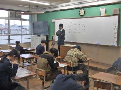 本日から2日間の日程で3年生学年末テストが行われます。生徒たちは真剣な眼差しで問題に向き合っていました。ベストを尽くして入試本番にも繋がることを期待しています。寒い日が続きます、くれぐれも体調には気をつけてください。