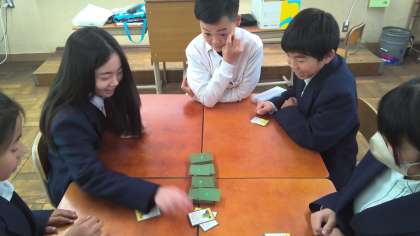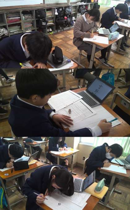 国語の授業では、百人一首に取り組んでいます。20首のトレーニングをした後は、お気に入りの1首を選び行書で作品を制作します。今日はタブレット端末を活用しながら、行書の形を調べて鉛筆で練習を行いました。