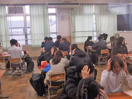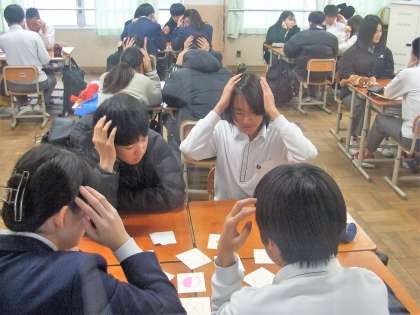 テスト1週間前、2年生は先日の学級閉鎖の回復授業で7限目授業を行っています。理科の授業では天気記号のマークをカルタにして、先生の読み上げる天気記号をグループ内で競い合って取り合っていました。その後の小テストで定着度を確認しました。