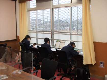 1年生はテストに向けて放課後学習を教室と学びの聖地に分かれて頑張っています。それぞれが課題を見つけて取り組んでいました。