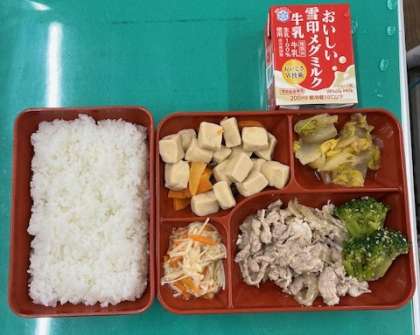 今日の献立は『豚肉のしょうが炒め』です。副菜にはブロッコリー、白菜のおかか煮、えのきと人参、高野豆腐などなど栄養たっぷりのメニューでした。