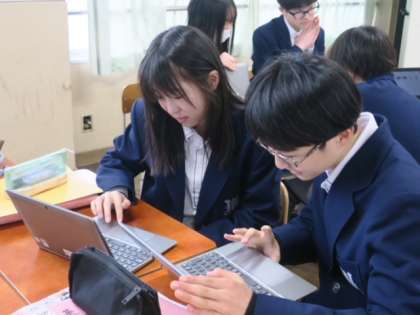 1年生は、来年度の職業体験に向けてて調べ学習を行っています。1年生の先生方にインタビューをし、「教師」という職業以外にその先生にあっている職業を調べ、パワーポイントを使ってプレゼンテーションを行います。それぞれに意見を出し合い、頑張ってまとめていました。