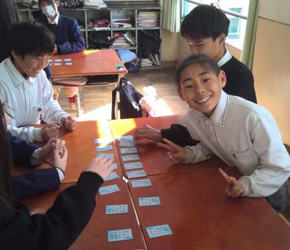 1年生は、3月12日の百人一首大会に向けてトレーニングを行いました。3〜4名のチームに分かれ、5色百人一首を活用しました。