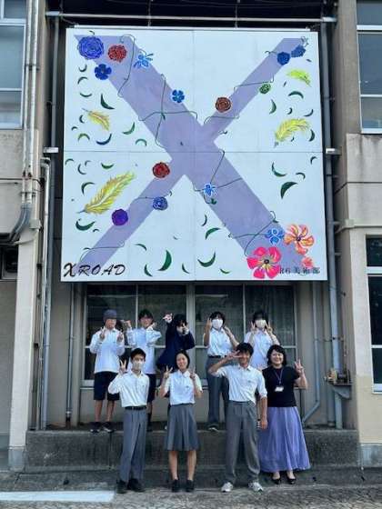 先日一度設置したタペストリー。台風の影響で少し修繕を行いました。そして本日、堂々の完成です!!制作してくれた美術部の皆さんと記念撮影です!