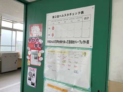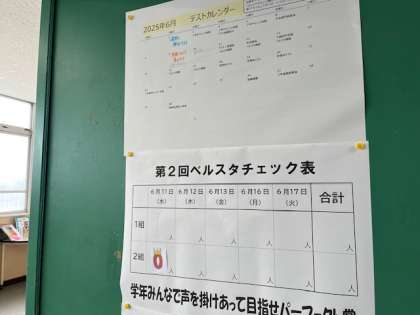 テスト前週間でもある今週、中央委員会ではベルスタの取組みを行っています。昨日委員長から全校放送で、自分たちで学びの良い環境を作っていきましょう!と前向きな呼びかけがありました。各学年のフロアには昨日の結果が張り出されています。