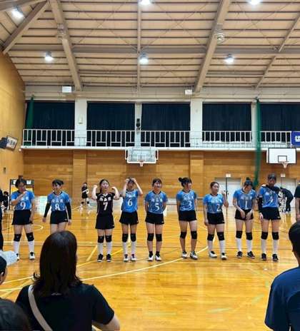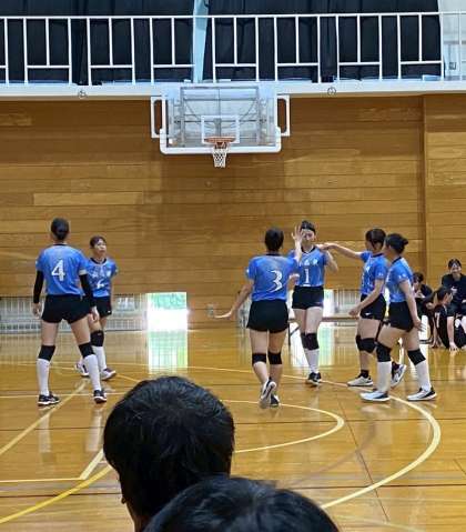 女子バレー部の夏季大会が始まりました。緊張の1回戦、対戦校は部員も多く応援団の声援が会場に響いています。しかし、試合が始まると向島東中バレー部の怒涛の攻撃が始まりました。コート内で選手たちが躍動します。そして、コートの外からは控え選手や保護者からも多くの声が掛けられます。
