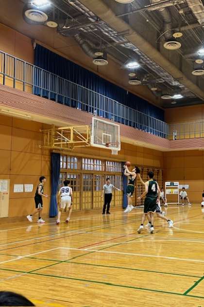 続く男子の試合、女子の雪辱を果たすべく気持ちの入る試合。出だしから怒涛の攻撃を仕掛け15-8で1pを終え、2pへ。ゴール下の争いも身体を張ってボールをキープ。そこらかの速攻も決まり前半33-14で終了。後半も安定したゲーム運びを続け66−43での勝利。控えの下級生も全員出場し戦うことができました。