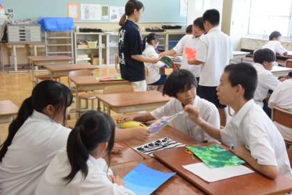美術室では1年生の美術の授業が行われていました。グループで絵を見て、それぞれの感じたことを出し合っていました。