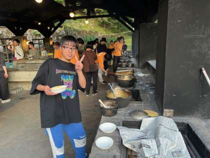 夕飯の飯ごうすいさんが行われていました。カレーと焼きそばを作って美味しそうに食べています。おかわりもたくさんできて大満足!
