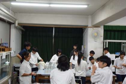 自分たちで実験器具を選び、本時の目標の結果を得るための実験方法をグループで考えていました。さすが1年生、みんなで協力して考える姿がとてもよかったです。