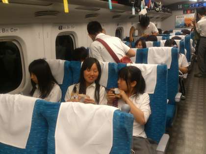 新幹線車内での食事風景です。東京駅到着後,班別研修を行います。
