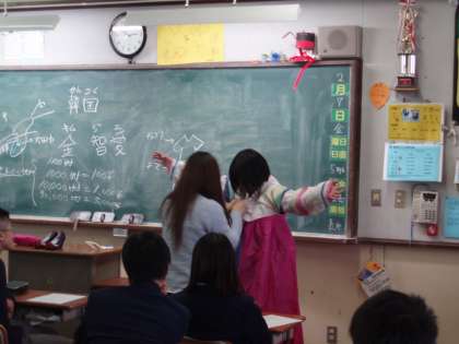 人権学習の最後として韓国からの留学生を招いて話を聞きました。3人の留学生の方がそれぞれに韓国について話をして下さいました。K-popから民族衣装,食べ物など韓国の文化について知ることができました。違う文化と触れ合うことはとっても大事なことです。日本以外にもたくさんの国がありそれぞれに文化があること,それをお互いに尊敬できれば争いはなくせるのではと思います。「近くて遠い国」という言葉が韓国と日本の間を表すのに使われることがあります。その距離を縮めるためにもお互いの文化を知り,尊重していきたいですね。韓国の留学生が異国の言葉である日本語で自国の文化を伝えようとされている姿からみんなに何かが伝わっていればと切に思います。