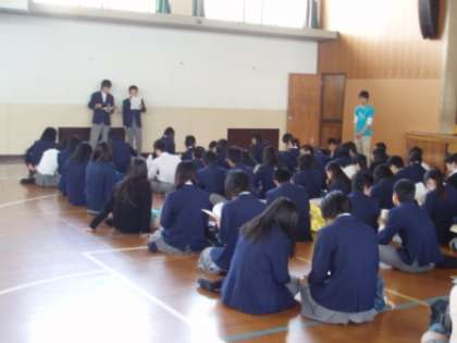 1時間目は授業,2時間目は学活で最後の確認。気分が盛り上がります。3時間目は集会。修学旅行委員の進行で各委員会からの連絡がありました。新幹線の乗車練習ももう一度しました。細かな注意事項もありましたが,それはみんなで楽しく3日間を過ごすためのもの。家でもう一度,確認を。スローガン(お・も・い・で)の通りお・もいっきり楽しみ,も・り上がってもんじゃを食べ,い・ろいろな体験をし,で・無事に帰ろう!