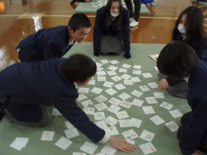 冬休みの国語の課題としてみんなが作ったいろはカルタを使ってカルタ大会が行われました。時間をかけて作った札はどれも力作ぞろいです。札をとった瞬間の歓声や楽しそうな顔,何より札がすくなくなっていくにつれて頭を寄せ合い,小さくなっていく輪が微笑ましかったです。準備から当日の進行までやってくれた図書委員のみんな,どうもありがとう。この冬一番の寒い日でしたが,体育館の中は温かい空気が流れていました。