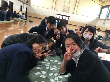 1年生のカルタ大会に引き続き,2年生では小倉百人一首を使って百人一首大会を行いました。一首ずつ詠まれるたびに歓声が起こり,1枚1枚頑張って取ろうという真剣な姿勢が伝わってきます。最初は国語の先生が詠んでいたのですが,他教科の先生,他学年の先生,そして事務職員と飛び入りで色々な人が詠む場面もあり,とても和やかな雰囲気で行うことができました。事前の準備や当日の進行は図書委員でがんばって進めてくれましたし,終わった後の畳の片付けも2年生みんなで手際良く行ってくれたところがとても印象的でした。