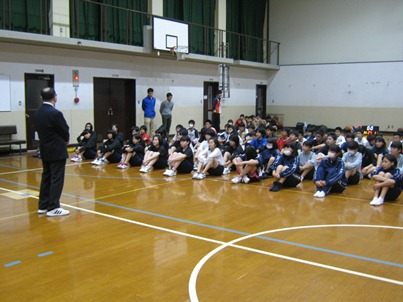 開会式の行進練習も最終日です。あいにくの雨で体育館での練習となりました。練習の後,校長先生から「最後まであきらめず粘り,夏につながる大会にしよう。」という激励のことばがありました。そして生徒会長から「向島東としてかっこよくがんばりましょう。」という呼びかけに大きな拍手が起こりました。29日に初戦を迎えるサッカー部のキャプテンは突然の指名にもかかわらず,試合に向けての決意を発表してくれました。