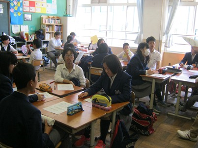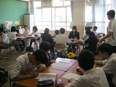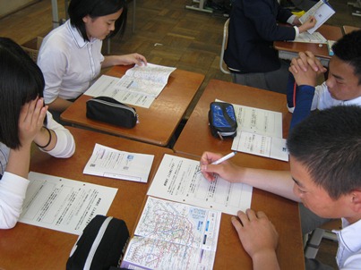 修学旅行が間近に迫っている3年生は「班別行動中,メトロがとまったら?」という設定で緊急時の行動や協力について考えました。それぞれの班で色んな意見が出されました。本番に向けて班のメンバーの結束も高まりましたね。