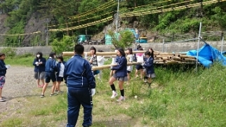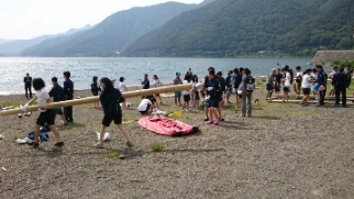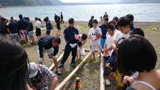 いかだ作りがスタートしました。各クラスの団結力を発揮するときです。役割分担をして,各クラスしっかり協力していかだを完成させましょう。完成後のクラス対抗のいかだレースの結果はいかに!