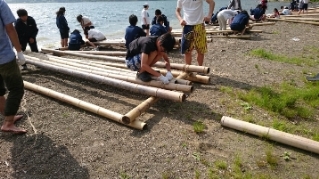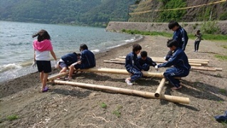 いかだ作りに苦戦中!しかし少しずついかだらしくなってきています。あと少し頑張れ!