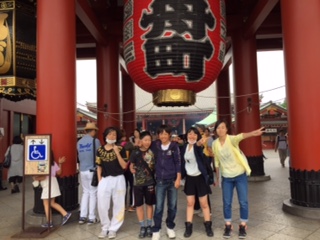 浅草にて。お馴染みの「雷門」は50年ぶりに改修工事をするそうです。今週から工事で残念ながら雷門をバックの記念撮影ができなかったそうですが,生徒たちはしっかりチェックを受けています。イレギュラーにもしっかり対応していますね。
