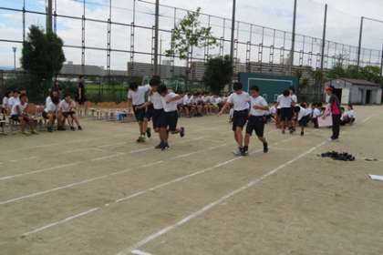 行進練習,開閉会式の予行の後,当日のプログラムにしたがっての練習です。先ずはバラエティー走の様子から。