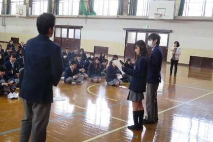 今日,3時間目に第2期のふり返りをする集会を持ちました。各クラスで話し合ったふり返りを中央委員がまとめて,発表をし,学年の第3期の目標も披露してくれました。第3期の目標は「3年生になる自覚を持ちながら2年生最後を良い思い出にする」です。この集会に向けて中央委員のみんなが放課後,何度も集まり準備をしてくれました。ありがとう。後期になって初めての大きな仕事をしっかりとやってくれましたね。図書委員長からはお正月明けの百人一首大会に向けてのアピールもありました。第3期はあっという間に過ぎていきそうですが,目標にもあるように3年生につながる大切な学期です。更に「つながり」を深められるよう1日1日を大切に過ごしていきましょう。