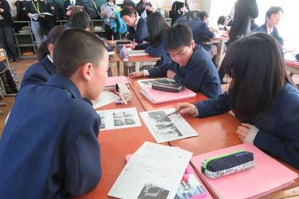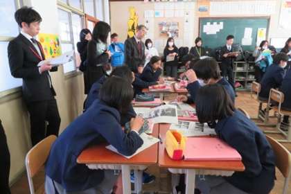「アクティブ・ラーニングのプロセスを通して,主体的・対話的で深い学びを実現するための実践研究」という研究主題のもと,各授業では生徒たちが意欲的に活動していました。だんだんと緊張もほぐれて,活発に意見交流を深めることができました。