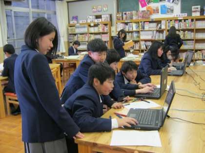本日,社会科の授業で図書室を利用した調べ学習を行いました。各班で調べたい都道府県とテーマを決め,ポスター作成と発表のために情報収集をしました。本を使う人,パソコンを使う人など自分に合った方法で調べていました。また,学校司書の先生にアドバイスをもらいながら,本を見つけている人もいました。班で協力をしていい作品にしてくれることを楽しみにしています。