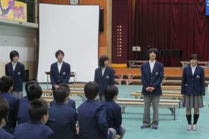 3年生が退場した後,1,2年生で取組みをふり返りました。生徒会本部のみんなが中心となって取り組んだ今年の「3年生を送る会」も大成功でした。本部の人からのふり返りに,3年生が卒業した4月以降も新入生を迎え,更に東をよくしていけることを確信しました。