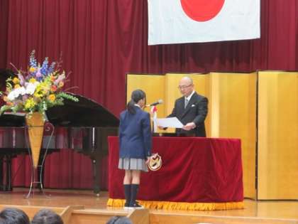 卒業証書の授与です。担任の先生の呼名で人ひとりが壇上に上がり,校長先生から証書を受け取りました。