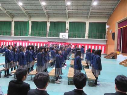 PTAの方から卒業記念品が贈呈され,式もいよいよクライマックスです。卒業の歌「旅立ちの日に」の歌声が体育館に響き渡ります。