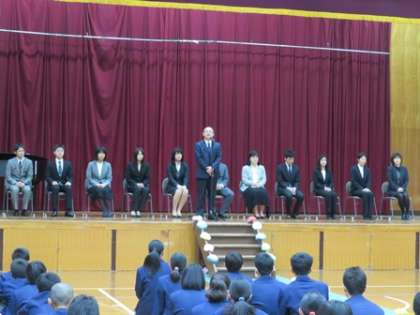 本日,9時から向島東中学校 体育館にて離任式を行いました。離任される先生からメッセージを頂きました。先生方からの温かい言葉が生徒にしっかりと伝わっていました。代表生徒からはお世話になった先生方へ感謝の気持ちを伝えました。花束贈呈では生徒も涙をこらえる様子がありました。