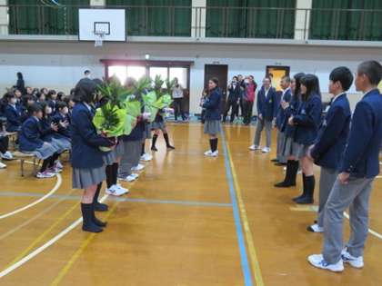 1年生に観葉植物とマジックペンが贈られ,3年生からの発表です。さすが最高学年という歌声。合唱が終わった後,会場は静まり返るくらいでした。