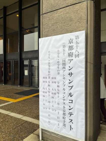 先週末に京都府アンサンブルコンテストが八幡市文化市民ホールで行われました。本校は管打8重奏での演奏でした。3年生が引退し1.2年生だけの初めての演奏で少し緊張した面持ちでしたが,見事立派な演奏を奏でてくれました。結果は銅賞。おめでとうございます!